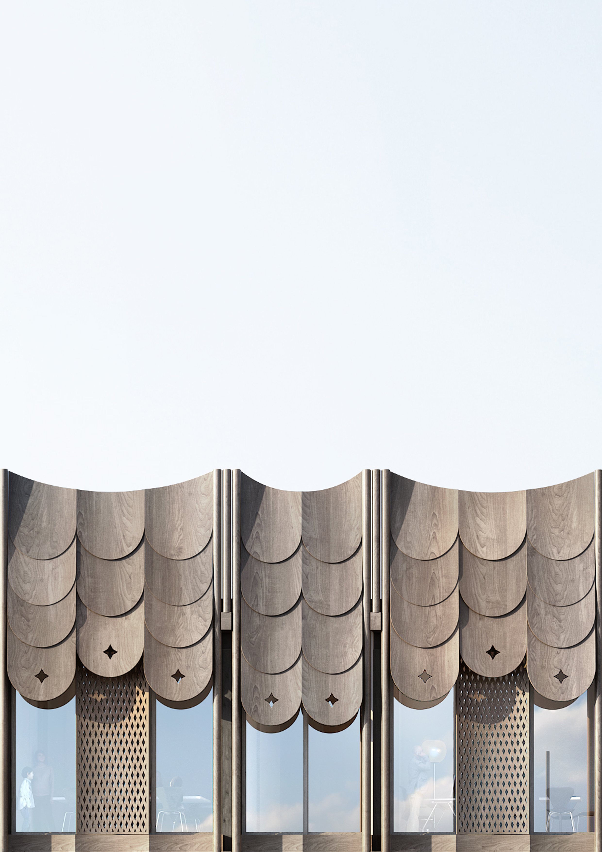 Pour ce qui concerne les façades, deux éléments architecturaux viennent définir le bâtiment : les panneaux écailles, couronnement du bâtiment, qui font office de garde-corps technique, et les panneaux treilles, bardage et protection du pare-pluie des M.O.B.
